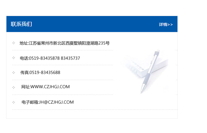 地址:常州市新北區友邦商務大廈1幢16、17層  電話:0519-85101652  傳真:0519-85112595  郵編:213022  網址:www_cz-jiayue_cn.yxqhsy.com  郵箱:xiajifengaa@163.com